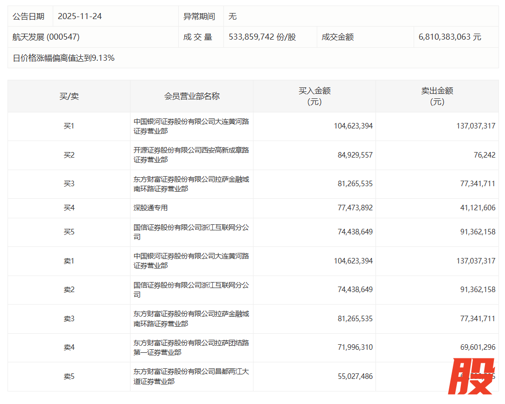 航天发展今日涨10.00% 陈小群席位买入1.05亿元卖出1.37亿元航天发展今日涨10.00% 陈小群席位买入1.05亿元卖出1.37亿元