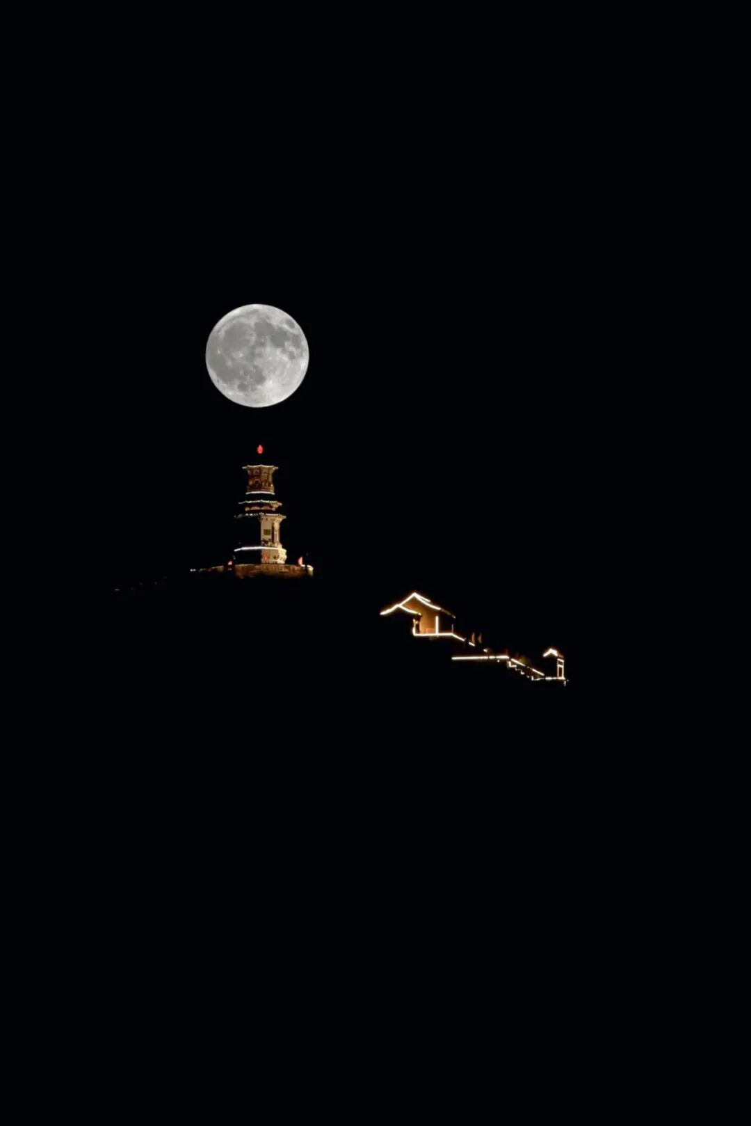 古塔悬红月(多重曝光)。 赵树生摄